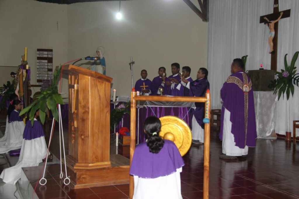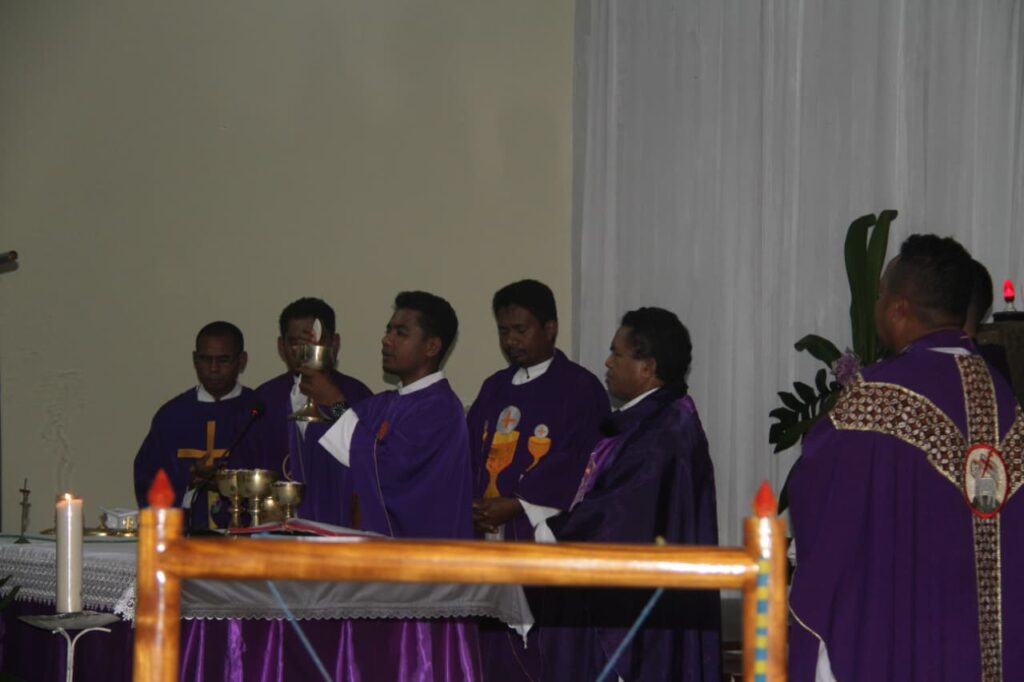 Sesampainya di gereja, Salib Pra-SYD IV ditahtakan dengan penuh hormat dalam perayaan Ekaristi yang dipimpin oleh Pater Lam, CSsR. Dalam homilinya, ia mengajak kaum muda untuk memiliki keberanian dalam menentukan pilihan hidup.